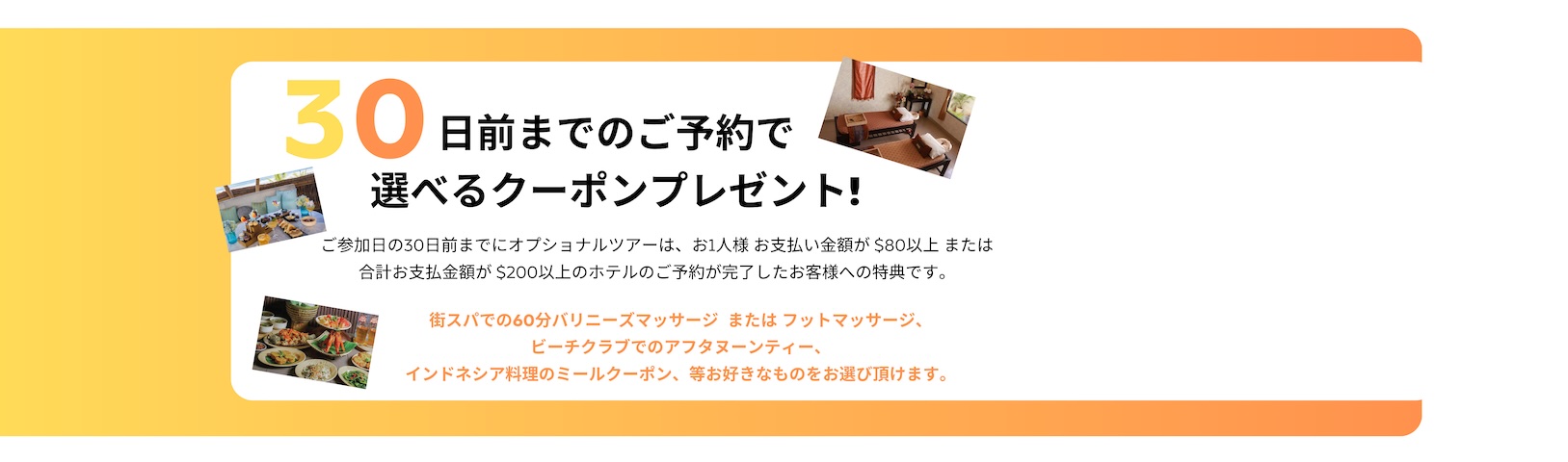 【ホテル特典・サワンガン ジュニア スイートのお部屋が対象です。】 ⚫︎3泊のご予約で、ご滞在中飲食にご利用頂けるバウチャー Rp 1,880,000分(1部屋)。 【ホテル特典・ザ リッツカ...