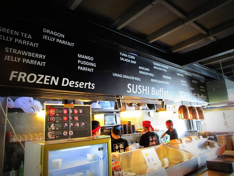 そのカウンターにはディナータイムにオープンするトッピングビュッフェコーナーがあり、かき揚げ Rp 6000、餃子 Rp 8,000、鶏串カツ Rp 8,000、鶏から揚げ Rp 8,000、豚チャーシュー Rp 16,000、鶏チャーシュー Rp 12,000、タコボール…etc等、寿司ビュッフェにはアボカドドラゴンロール Rp 12,000、カリフォルニアロール Rp 12,000、炙りサーモンロール Rp 20,000、あと枝豆等がありラーメンと一緒にちょこちょこと頂きたくなるものばかり!が並びます。