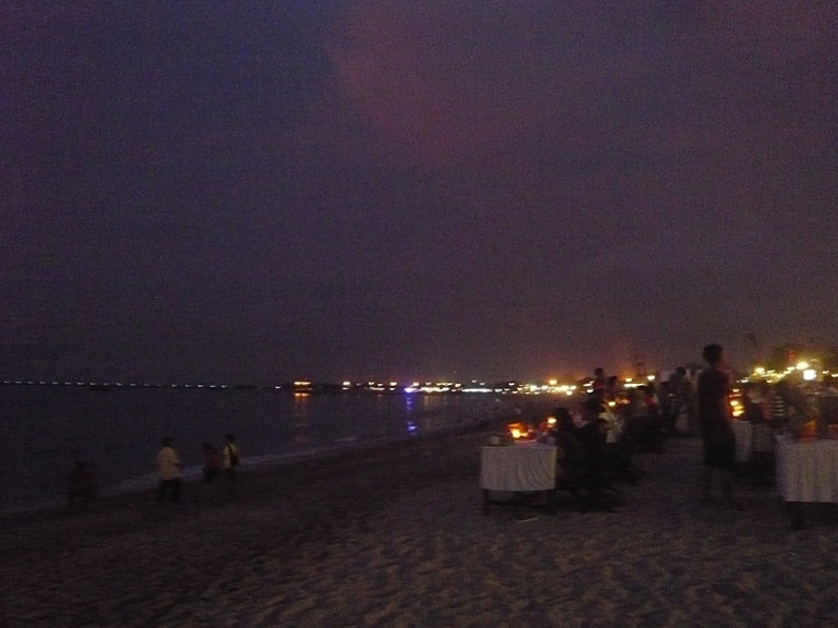 漁船の灯り、空港のライトが海にキラキラと映り…月を眺めながら、波の音が耳に心地よく、夜空の下バリ島の夜がふけていきます。海辺でいただく魚とサンバルの味は格別なもの。こういう地元の雰囲気の中でのお食事というのはやっぱりいいものですね。