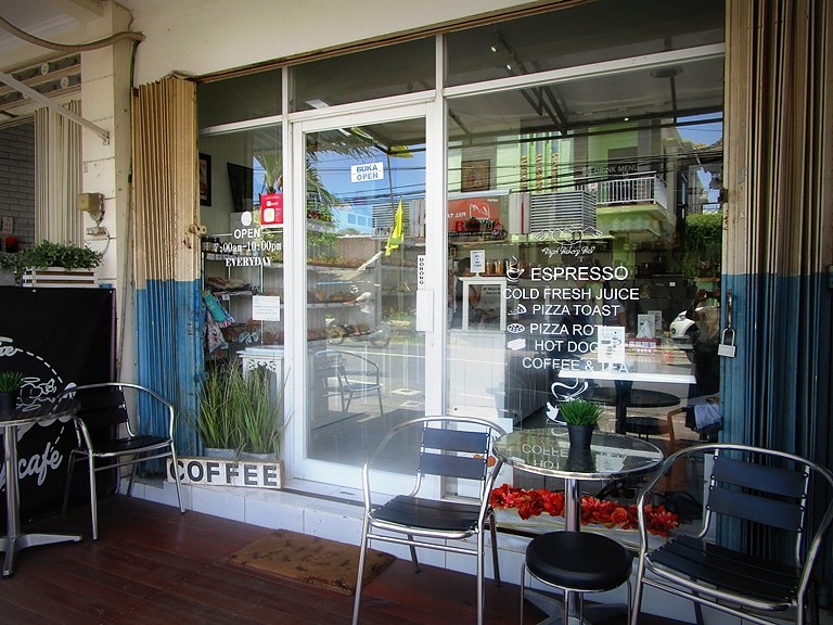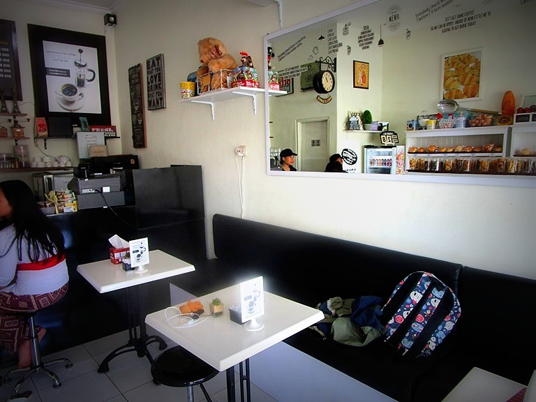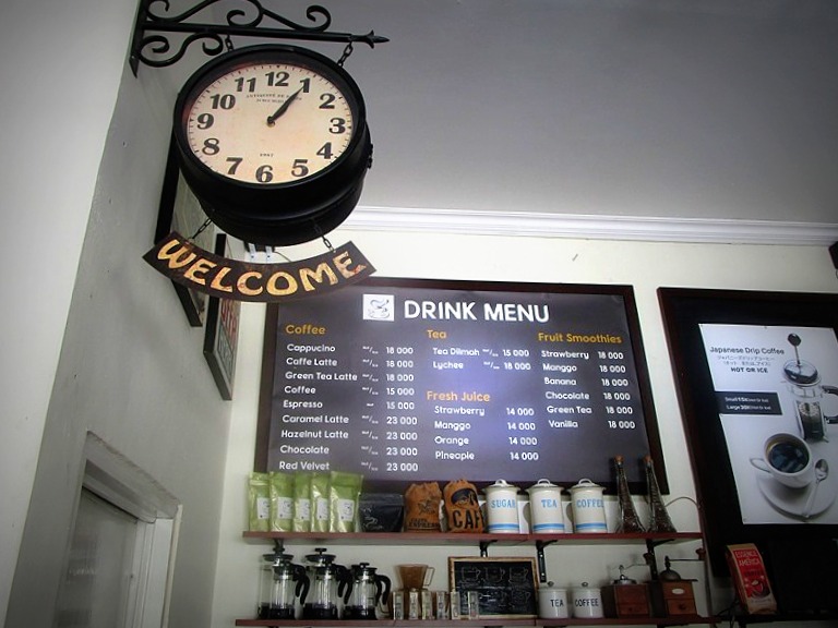 店内には喫茶スペースもあります。後から気がついたのですが、ホットドックやピザトースト、って書いてありましたのでお食事できるんですね。コーヒー、ティー、フレッシュジュース、スムージー等。カプチーノがRp 18,000とはお手頃価格。