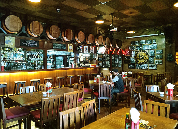 店内はちょっと暗めの照明や樽のディスプレイなどがいかにもパブっぽい雰囲気。