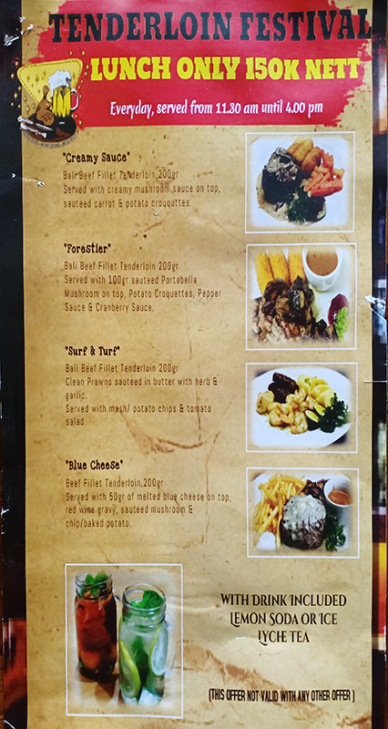 さて、そんな人気のアリーナですが、すごくお値打ちなランチセットが登場しました!その名も「テンダーロインフェスティバル」!200gのテンダーロインステーキにドリンクもついてRp.150,000ポッキリ!4つの種類から選べます。