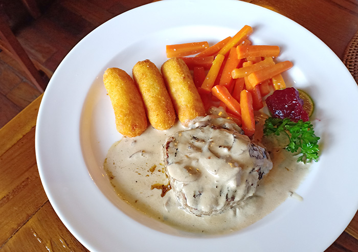 まずは「クリーミーソース」。200gのテンダーロインステーキに濃厚なマッシュルームクリームソースがたっぷり乗ってきます。添えは人参のソテーとポテトコロッケ。