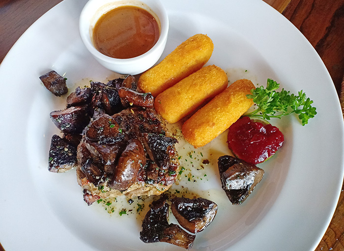 「フォレスティアー」。200gのテンダーロインステーキの上には大きくカットされたポータベラマッシュルームがゴロゴロ!ペッパーソースかクランベリーソースでいただきます?添えはポテトコロッケです。