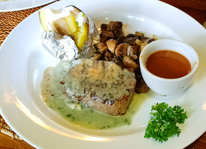 200gのテンダーロインステーキに50gのとろ〜り溶けたブルーチーズが!う〜ん、このこってり感たまりません。仕上げに赤ワインを使ったグレイビーソースで完璧なこってりへ!添えはほっこりベークドポテトとマッシュルーム。