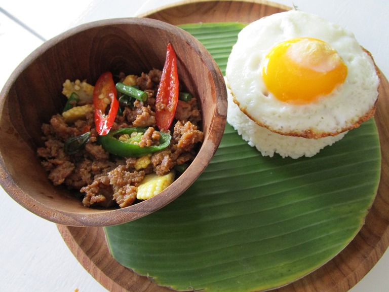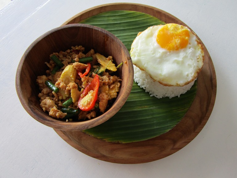 ポークの方が好みでした。帰りにナンプラーを買って家に帰りました。(笑)日本のレシピを見ているとピーマン、タマネギを入れるレシピが多かったのですが、私はタイリシャスを見習ってヤングコーンとインゲンです。