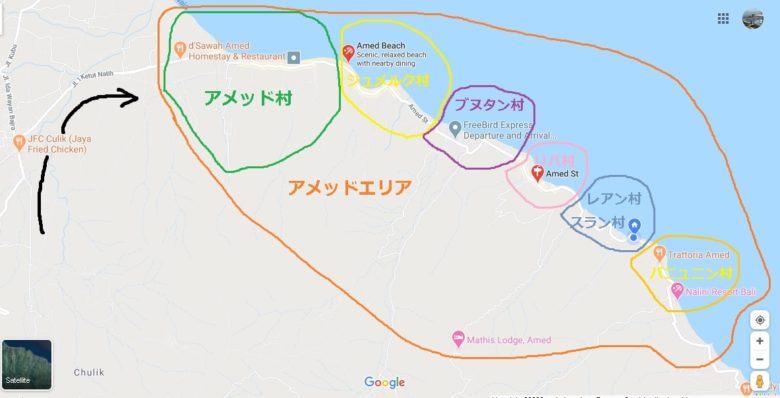 この地図は、グーグルマップから持ってきて、村の名前に分けましたが、感覚つかむために、試しにこのサイズでアメッド見てもらって、そのサイズのまま空港辺りまでスクロールしていただくと、なんと空港からチャングーの南部までのエリアと同じくらいになるのに気付かれると思います。