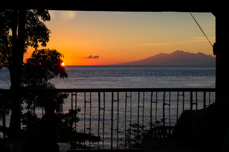 アメッドで見る朝日は、どこも特別なんですが、この宿も、正面にロンボク島リンジャニ山が見え朝焼け時には、はっきりとシルエットが浮かび上がり、それはそれは幻想的です。