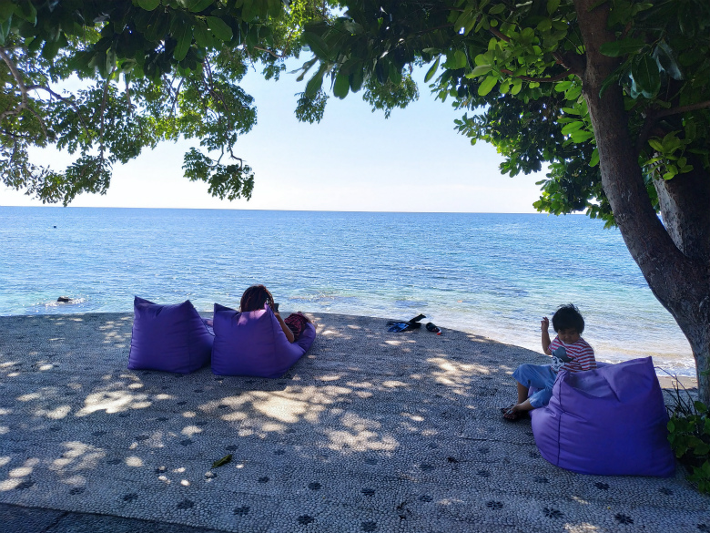 プールの前には浜に突き出たくつろぎスペースが…
