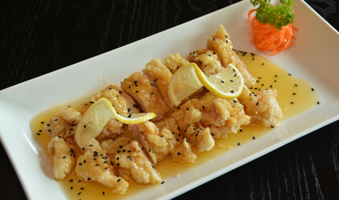 レモンチキン Rp.110,000。カリカリに揚がった鶏肉に天酸っぱいレモンソースがたっぷりかかっています。アツアツで食べたい一品。
