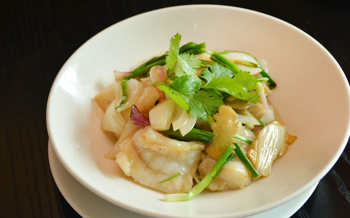 ジンジャーフィッシュ Rp.170,000。白身魚をフライにして、淡白なソースで味付けしたあっさり風味。ねぎやタマネギで更にさっぱり!メインの魚がすごくプリプリでまるでイカのような食感!