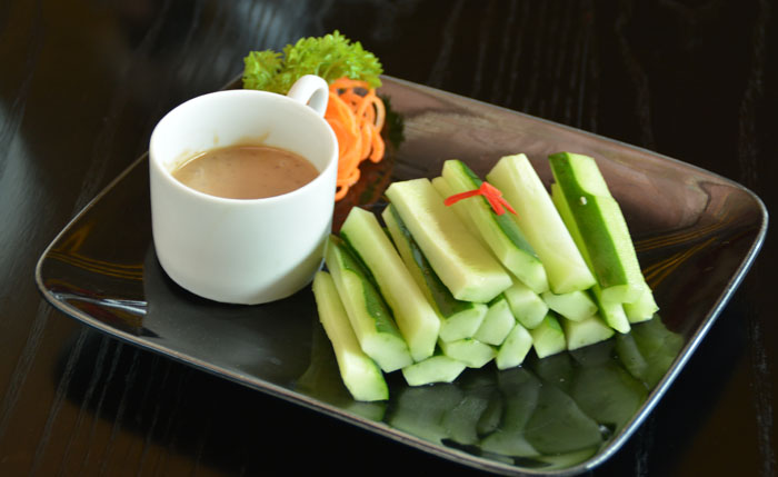 ↓前菜のクリスピーキューカンバー Rp.60,000はスティック状のキュウリにセサミソースをつけて。