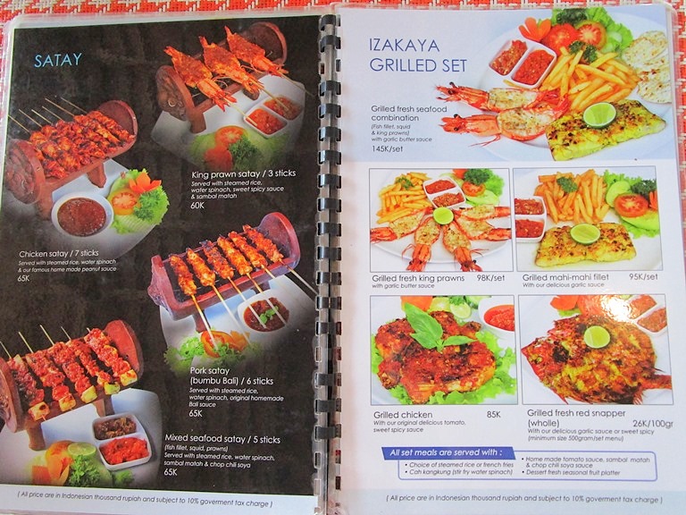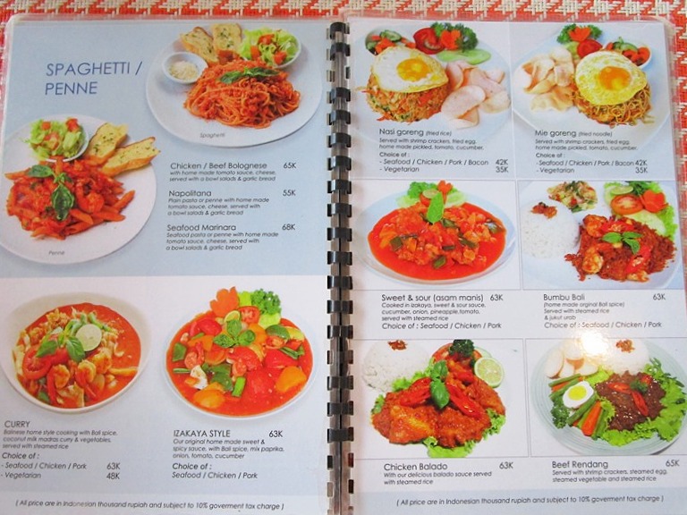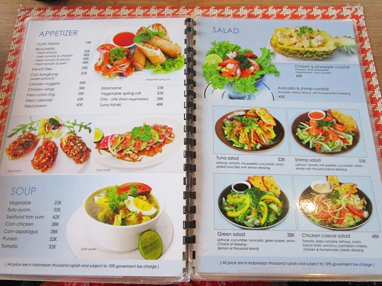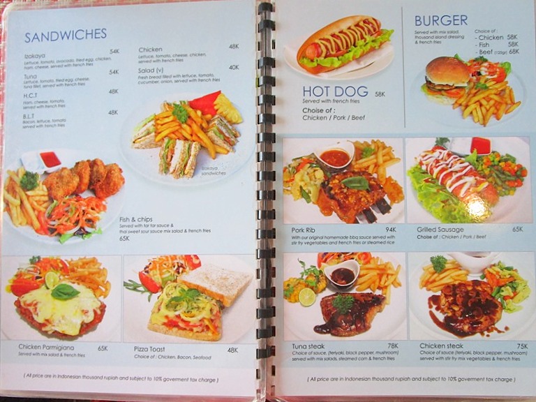 メニューはこちら。西洋料理、インドネシア料理、サンドイッチやバーガーにシーフード等々…