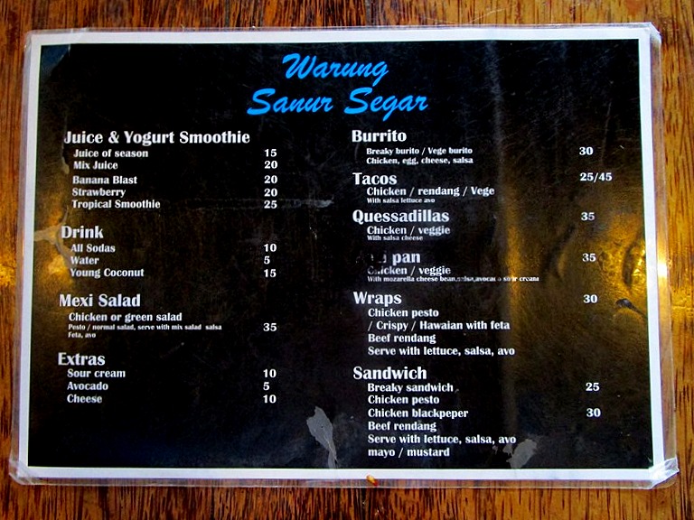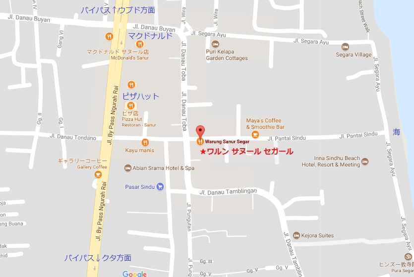 グーグルマップだとJl. Danau Toba No.11, Sanur,になっているのですが、Warung Sanur SegarのFBは、Jl.Pantai Sinduh No.2になっています。タンブリンガン通りを南クタから北ウブドへ向かいながら右折、海方面へインナシンドゥビーチホテルのあるシンドゥ通りに入りすぐの右です。タンブリンガン通りを左折するとカユマニスがある通りでバイパスに出ます。