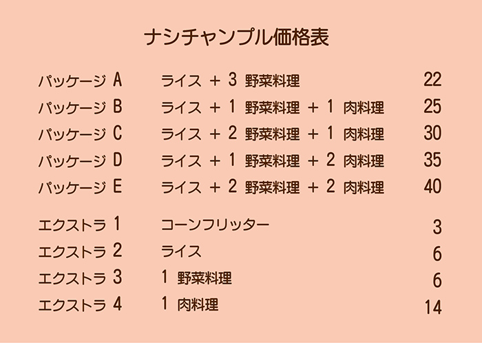 ナシチャンプルはレジ横に料金表があります。明朗会計!