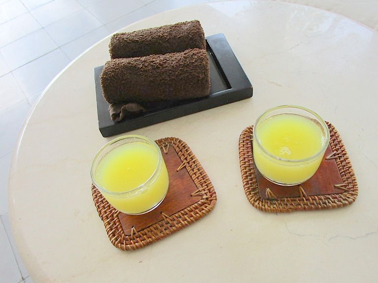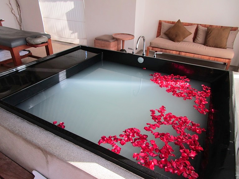 まずはじめにフットバスで足をキレイにしてもらい、ボディマッサージ60分、スクラブ30分、フラワーミルクバス30分まで、という内容。ボディマッサージはお好みのオイルの香りを確認して選択、スクラブはジャワニーズルルールかナチュラルココナッツから選びます。テラピストさんは基本的なスパ用語は日本語で話してくれたので意思の疎通は問題ありませんでした。最後は大きなバスタブフラワーバスでゆったりと寛ぐ時間…