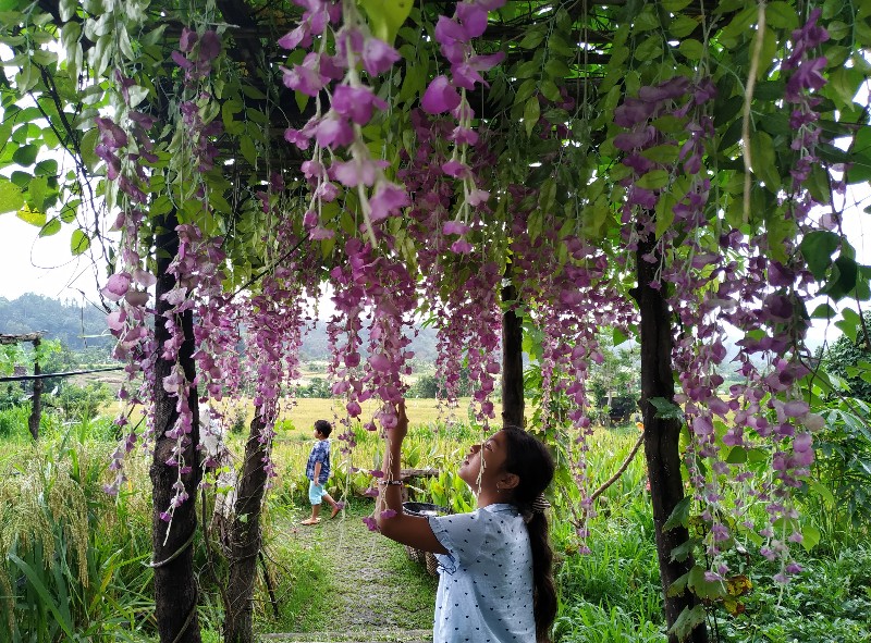 葉っぱは本物の棚に、造花の藤「うわぁーないわ・・・・」と思いますが、写真で見るとさまになるから不思議(汗)インスタ映えするってやつですね。