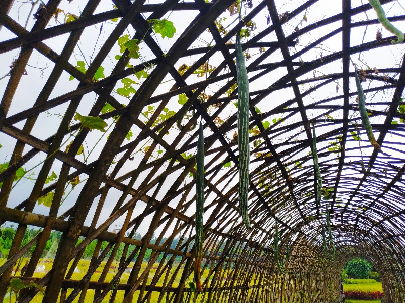 ただのトンネルかと思いきや、ヘビウリが絡まるように植えてあるので、ところどころにみごとな70cmくらいもある実がぶら下がっています。