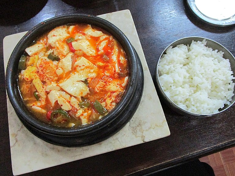 スンドゥブチゲ、ご飯付です。つるつるの豆腐がたくさん入っていて美味しかったです。あんまり辛くなかったので丁度良かった。