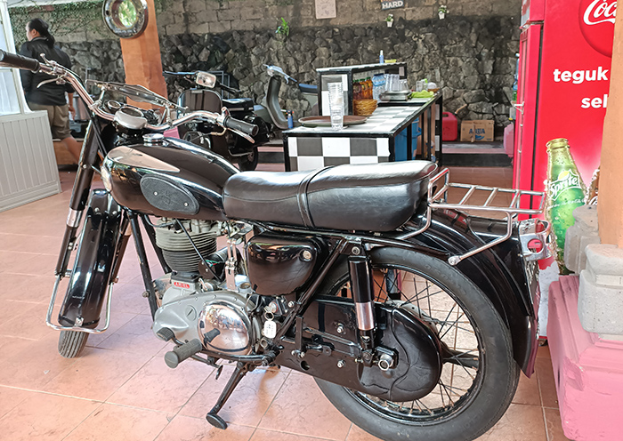ちなみにオーナーさんは大のバイク好きでお店にもなにやらいわく付きっぽいバイクが飾られています。
