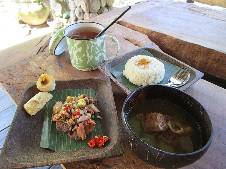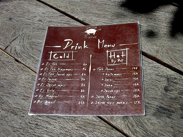 アイスティーは Rp 6,000。大きなグラスに一杯一杯入ってきます。メインはジューシーな豚のあげたのにサンバルマタのせ。イガスープにはごろんと骨、についてるお肉が美味しいです。そしてきゅうりが入っています。それ程辛くないのですが、味は濃い目なので半ライスおかわりしました。