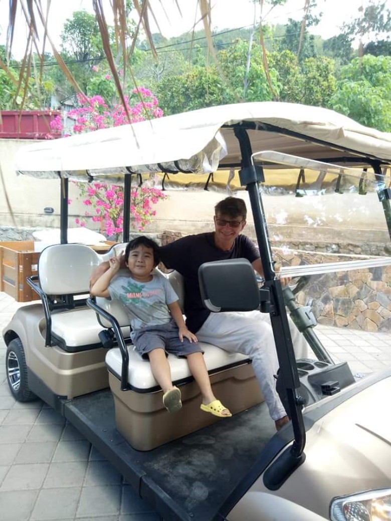 広大な敷地(いくら土地は安かったーーとはいえ、この場所への工事の資材運び水や電力の確保、大変な規模のプロジェクトだったでしょうねぇ)をこのバギーでカタカタカタカタとレストランに向かっての急な下り坂。