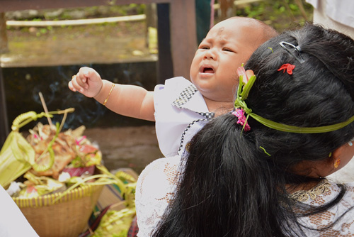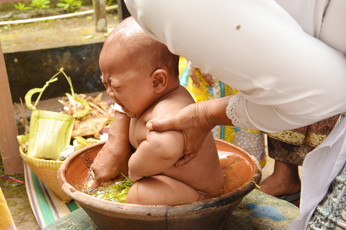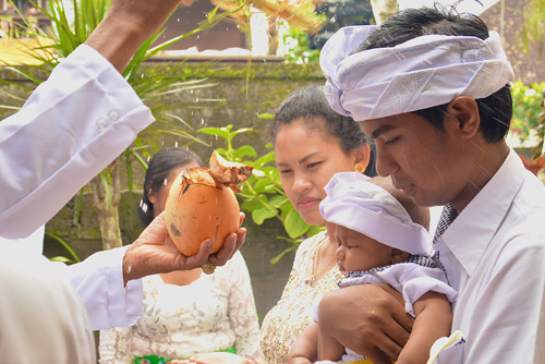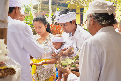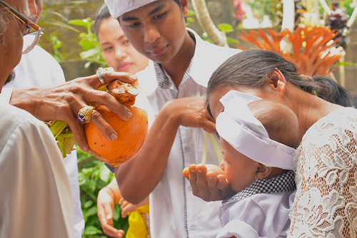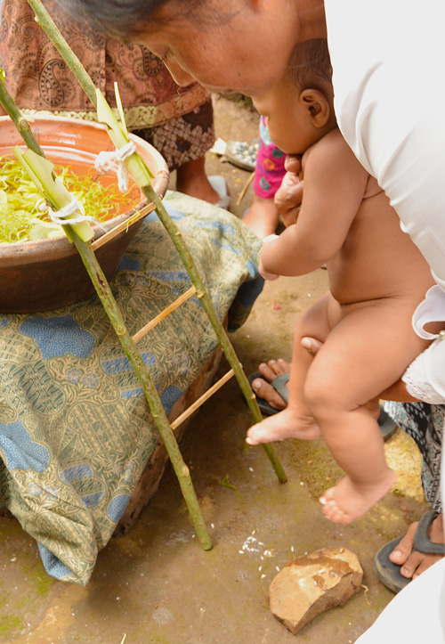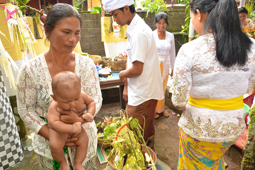 バリのウク暦に基づき、1ヶ月は35日で計算されますので、3ヶ月は105日になります。産後は母子ともにまだ不浄とされ、お寺などの神聖な場所には入ることができませんが、この3ヶ月の儀式が済めばお寺への出入りも晴れて自由になります。また、赤ちゃんはこの日、 別の世界から人間界へ魂が降りてきたとされ、初めて地面に足をつけることが許されるのです。