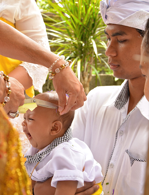 ↓次はプンデタ(高僧)による「ムプティック」。断髪式です。持って生まれてきた髪の毛は、お母さんの産道を通ってきていて不浄とされます。それを清めるための儀式です。断髪式といっても赤ちゃんの頭のてっぺんの髪、左右両サイドの髪の毛を少しずつ切るだけです。赤ちゃん、あくびしてます(笑)。