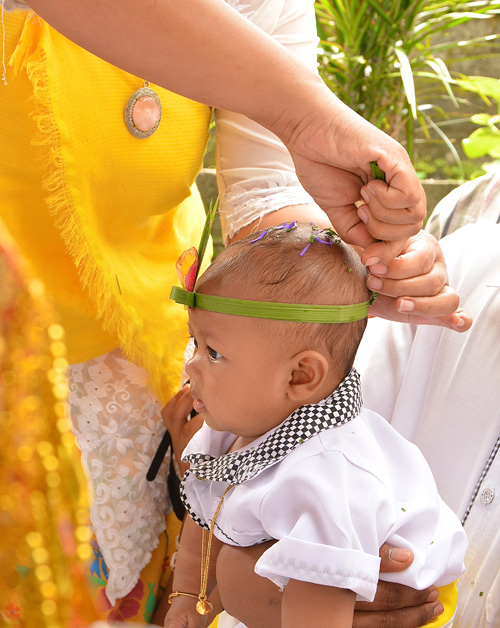 ↓断髪が終わったら、プンデタより清められた証であるアランアランという葉で作ったプラシスタを頭に巻きます。これは赤ちゃんだけでなく、お父さんとお母さんも巻きます。これをムジャヤジャヤというそうです。