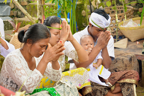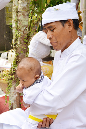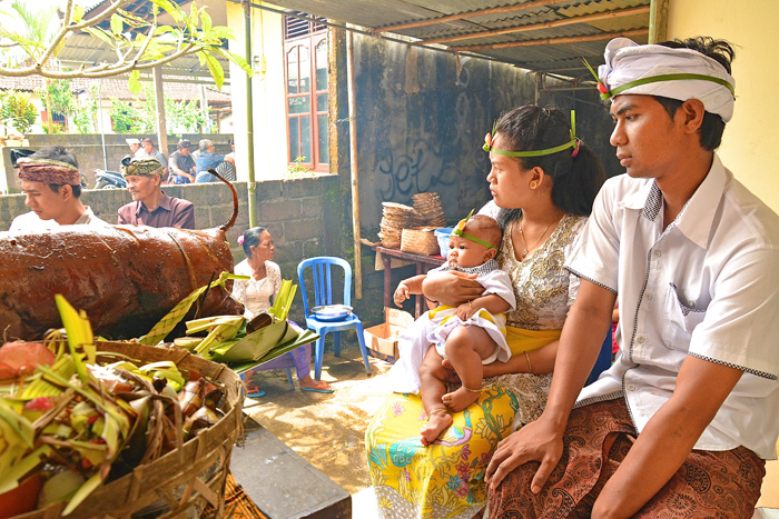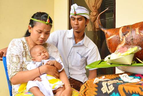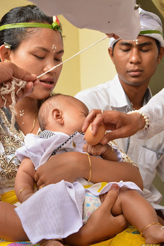 バリ島はバリ・ヒンドゥー教の島。華やかで荘厳な宗教儀式が有名ですが、バリ・ヒンドゥー教徒は生まれてから死ぬまで、数々の通過儀礼を行います。赤ちゃんの時に行なうのが、へその緒がとれた時の儀式、生後12日め、生後42日め、そして生後105日めに行う、3ヶ月のお祭り(ウパチャラ ティガブラン)です。