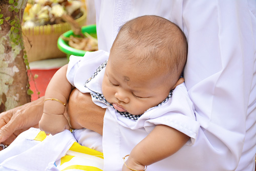 ↓最初にお供え物の前を3回まわります。赤ちゃんが裸ん坊にされているのは、あとで沐浴のまねごとをするため。