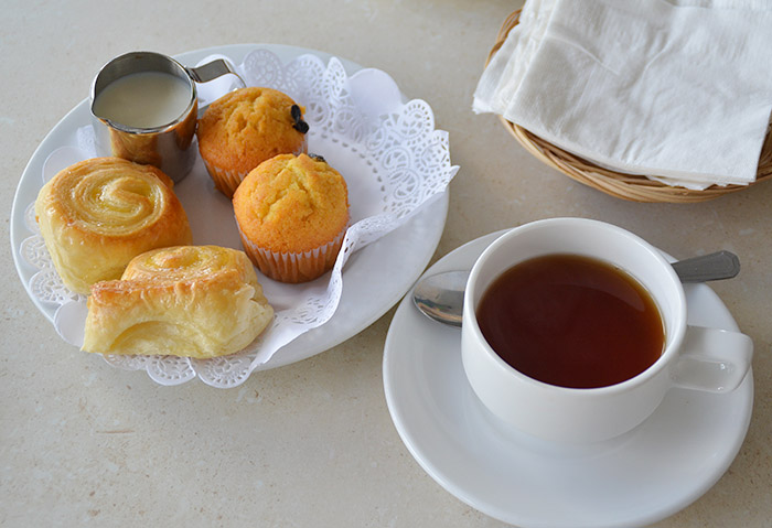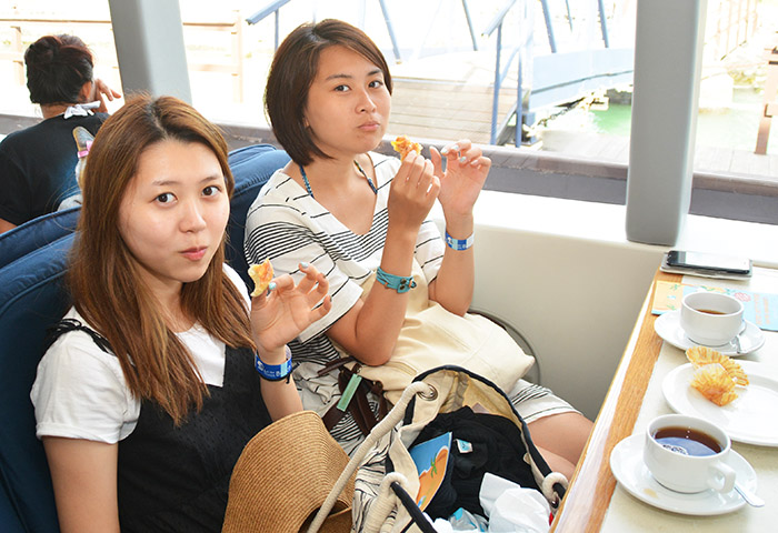 出発を待つ間、船内ではデニッシュやカップケーキのサービスが。飲み物はコーヒーか紅茶をいただけます。ホテルで朝ごはんをあまり食べられなかったので、ここでがっつり(笑)