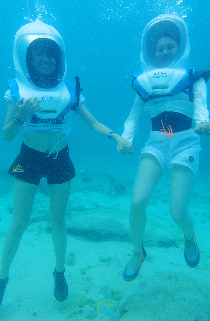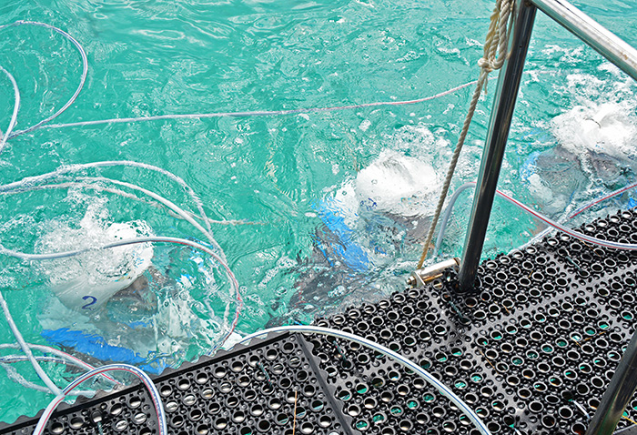 シーヘルメットの重さは約30キロ!なので水に潜る直前にかぶります。海水の体感重量は5キロくらいなんだそうですよ。ゆっくりと梯子を下りていきます。