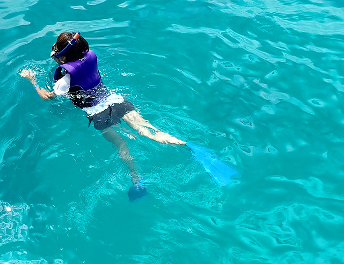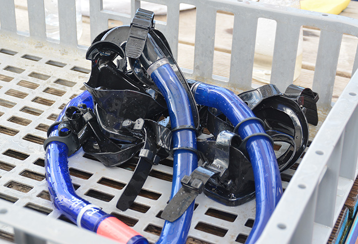 続いて●シュノーケリング!ライフジャケットを着用してマスクとフィンのサイズを選びます。