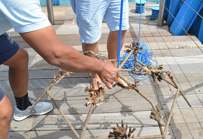 シュノーケリングの後は2018年8月からスタートした●サンゴ礁修復プログラムに参加。用意された特殊な金具に小さなサンゴを結束バンドで巻いていきます。