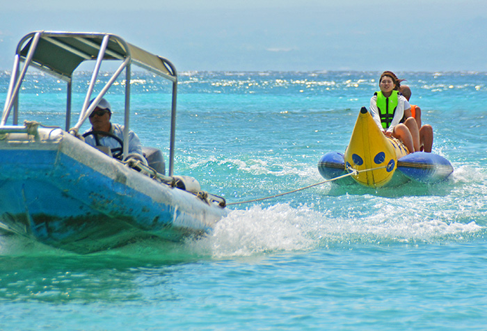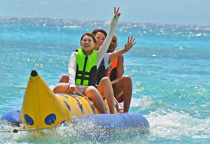 まずは●バナナボートから。ビーチエントリーしてぐるりと沖を1周します。何度でも乗れますよ〜(笑)風を切って走るバナナボートは爽快!