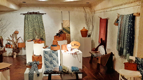 ↓ギャラリーではhou-houの草木染めバティックのスカーフやバッグなども展示販売