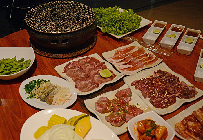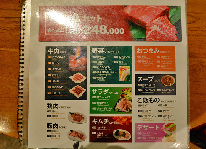 Aセットのメニューは牛、鶏、豚肉の他、BBQ用の野菜、サラダ、箸休めのキムチやおつまみ、スープ、ご飯もの、デザートまで入っています。なくなったらその都度また食べたいものを注文するというスタイルです。