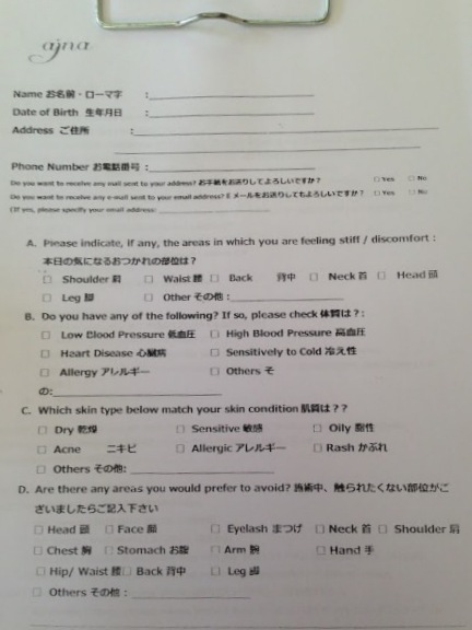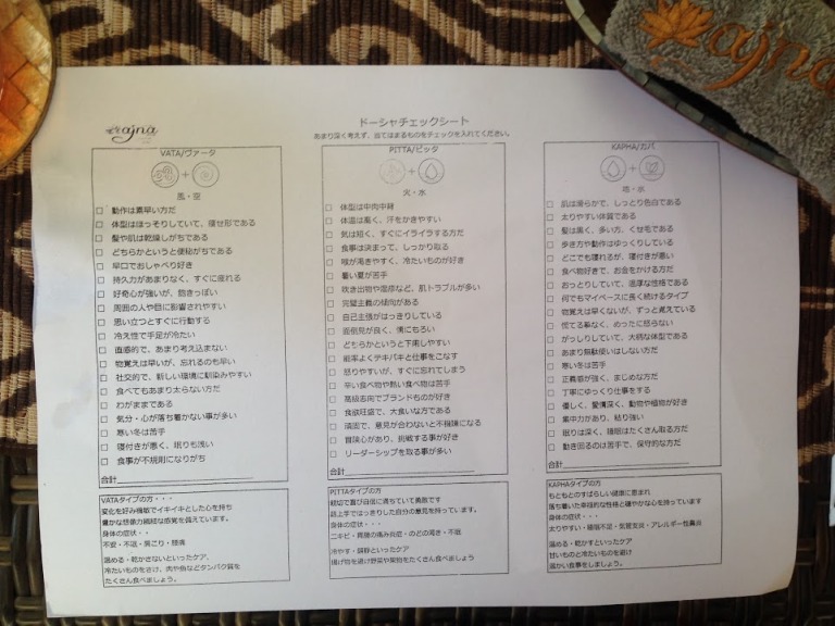 トリートメントオイルは、シートの該当項目にチェックして自分に合ったオイルを選んでくれます。香りだけでは自分に合ったマッサージオイルか分からないので嬉しいですね。みなっしーは左の「VATAヴァ-タ」でした。オイルの香りも好みでバッチリ!