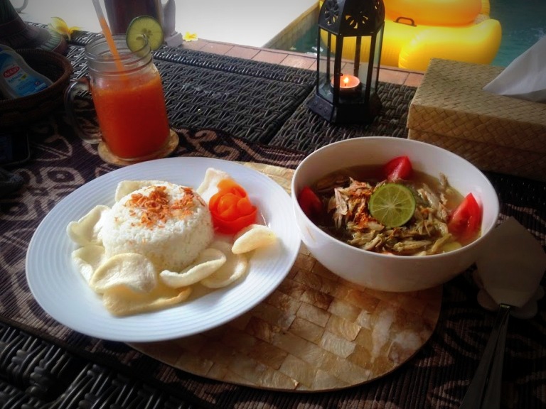 ソトアヤム(鶏肉と野菜、春雨のスープ)。こちらも辛くないので体にやさしい味。