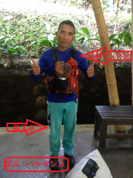 ラフティングって「水着だけ?」、「何を着ればいいの?」と、思いますよね。意外と日焼けするので水着の上に長袖Tシャツ+短パン+ヒールではないサンダルがお勧めです。毎日川を下ってるインストラクターは、こんな感じです。(確かみなっしーが10年程前に参加した時のインストラクターと同じ方でした・超ベテランで安心。)