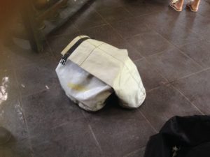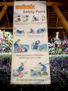 2時間程の川下りとなります。こちらでトイレをすませませて・着替えは更衣室がないのでホテルから水着を着てきた方がいいです。着替え等の荷物は黒色のスポーツバック(左)に入れフィニッシュポイントまでスタッフが運んでくれます。貴重品(携帯・カメラ・お金等)は、白の防水バック(右)に入れて一緒に川を下ります。途中・休憩ポイントで滝をバッグに写真撮影ができます。どちらも他の方と同じバッグに入れるので、自分の分はスーパーの袋に入れてからバッグに入れるといいですよ!