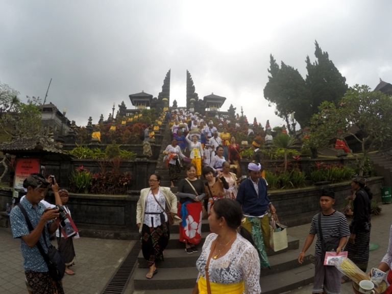 ブサキ寺院の大階段から、祈りを捧げた人が降りてきます。