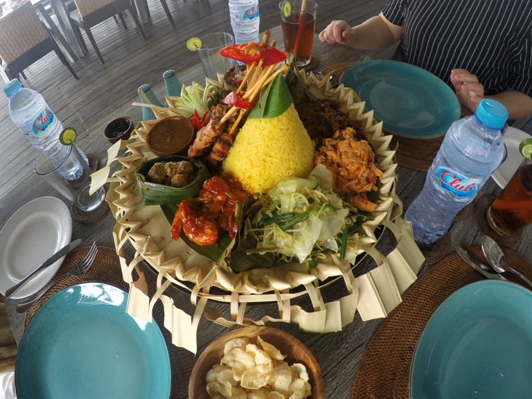 ムギブン(Megibung)というのは、一緒に食べるという意味のバリ語で、カランガッサム地区に残る伝統的な冠婚葬祭時の食事方法です。一つのムギブンを囲み皆で一緒に頂きます。真ん中にナシクニン(黄色いご飯)、その周りにサテ(焼き鳥)、ラワール(野菜)、アヤムスィル(鶏肉のサンバル和え)、エビ等…盛沢山。