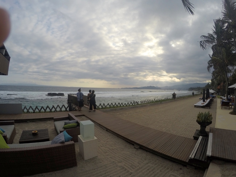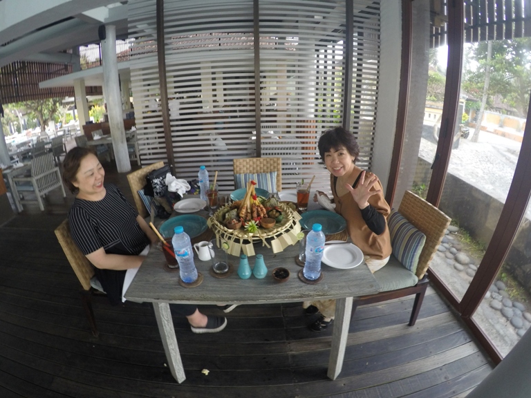 念願の割れ門で写真撮影をした後は、⑥バリ島東部の伝統料理「ムギブン」のディナー、ラマチャンディダサリゾート・ビーチ沿いのレストランへ行きましょう♪ずーっと山の景色が続いていたので、久々のビーチ。風が強かったですが海風が気持ちいい~~。