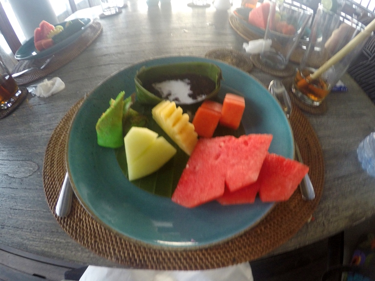 デザートはフルーツとバリのお菓子(黒米のプティング、緑のものはダダールグルン)。お腹いっぱい♥ご馳走様でした。(ピンぼけですみません…汗)