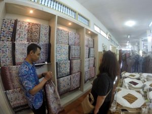 ①世界無形文化遺産に登録されているインドネシアのろうけつ染め「バティック」の工房を併設したショップへご案内→