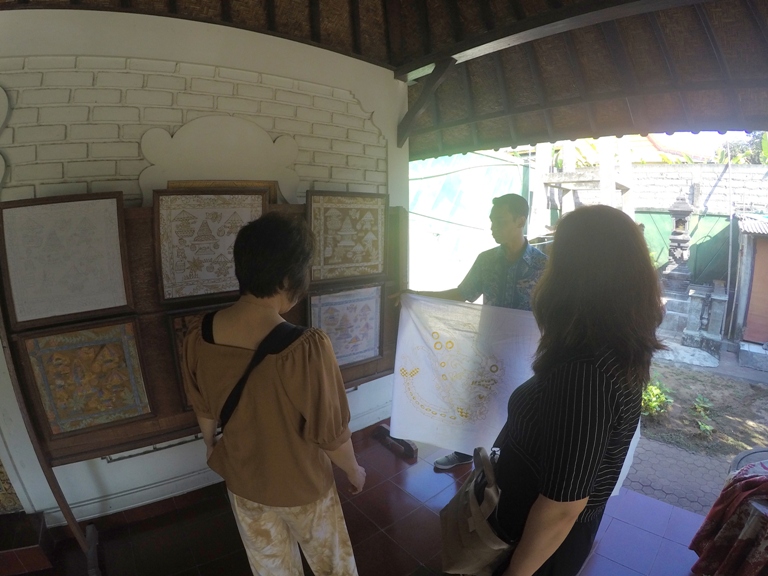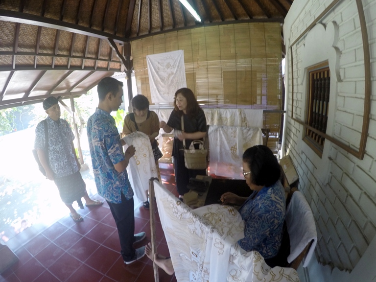 ①世界無形文化遺産に登録されているインドネシアのろうけつ染め「バティック」の工房を併設したショップへご案内。熟練されたイブ(インドネシア語でibuイブ=おばさんの意)が、下絵なしで直接布に絵を書いていきます。すごいの一言!