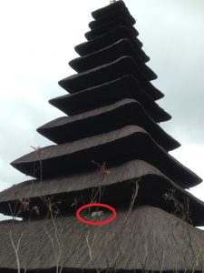 お祈りを捧げる場所には、一般の方は入れませんが外から見ることは可能です。中央の立派なメル(塔)と呼ばれる茅葺き屋根の多重塔が目を引きます。