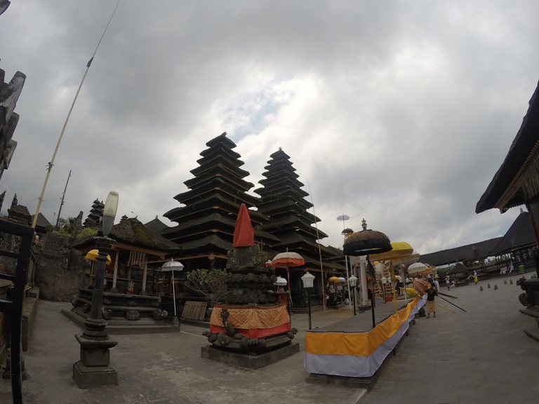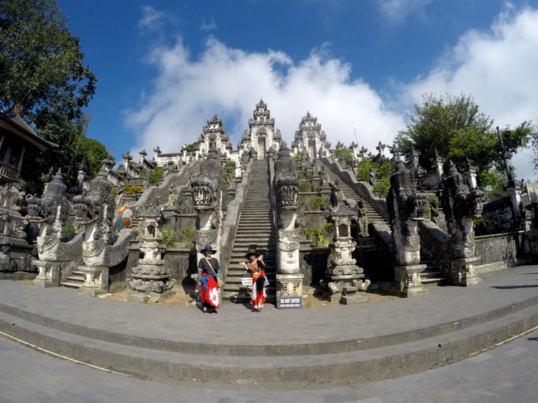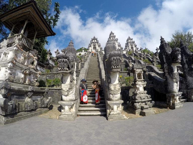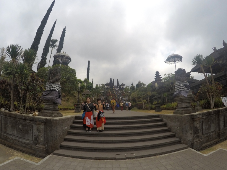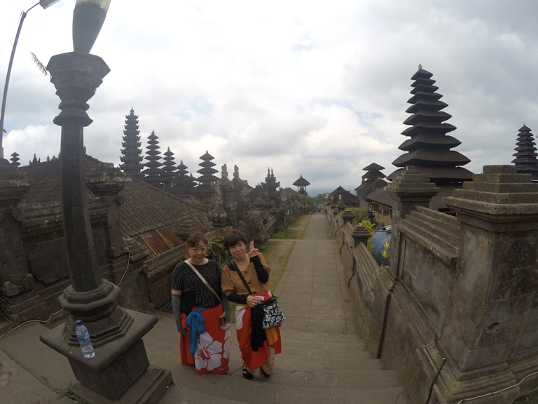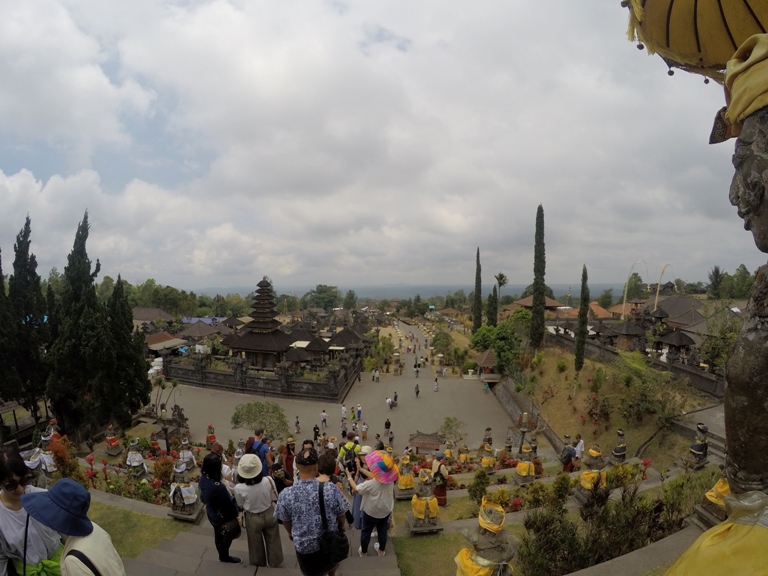 バリ・ヒンドゥー教の総本山・霊峰アグン山の中腹に建築された大小さまざまな寺院が30あまりの壮厳な宗教建築に囲まれ信仰の中心ともいえる場所で神聖な雰囲気が漂っています。天気がよければ後ろにアグン山がどーんと見えるのですが…雲が張ってアグン山が見えず残念…(涙)
